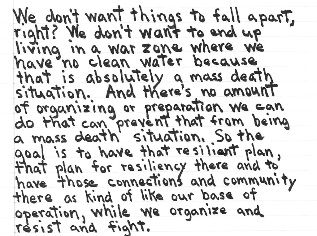 “So, the goal is to have that resilient plan, that plan for resiliency there and to have those connections and community there as kind of like our base of operation, while we organize and resist and fight.”