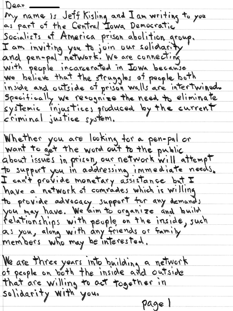 Letter writing can be very helpful, not only to those who are incarcerated, but as a way those outside the prison walls to learn of conditions in prisons. And organize ways to address conditions. I’ve written about the prison letter writing group I’ve been involved with. That is organized by one of my Mutual Aid friends as part of the work of Central Iowa Democratic Socialists of America.