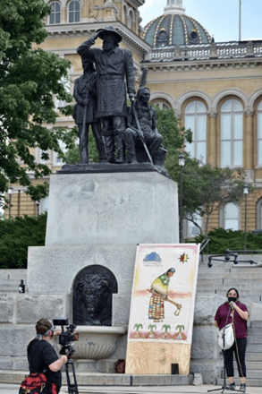 Another event where I took photos was a gathering on the State Capitol grounds related to racist statues. In this photo Sikowis is speaking at the Pioneer statue.