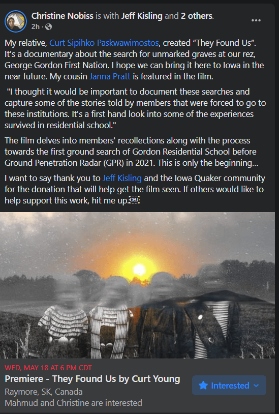 To pull this all together, here is the link to a recent blog post, Midwest Quakers and Native Peoples, which describes how I was blessed to become friends with Indigenous folks in the Midwest and the history of some of the work we’ve done together. It also talks about the Indian Residential Schools and includes a letter from Curt Young, member of George Gordon First Nation, describing the documentary he created, “They Found Us”. Sikowis is also a member of George Gordan First Nation.