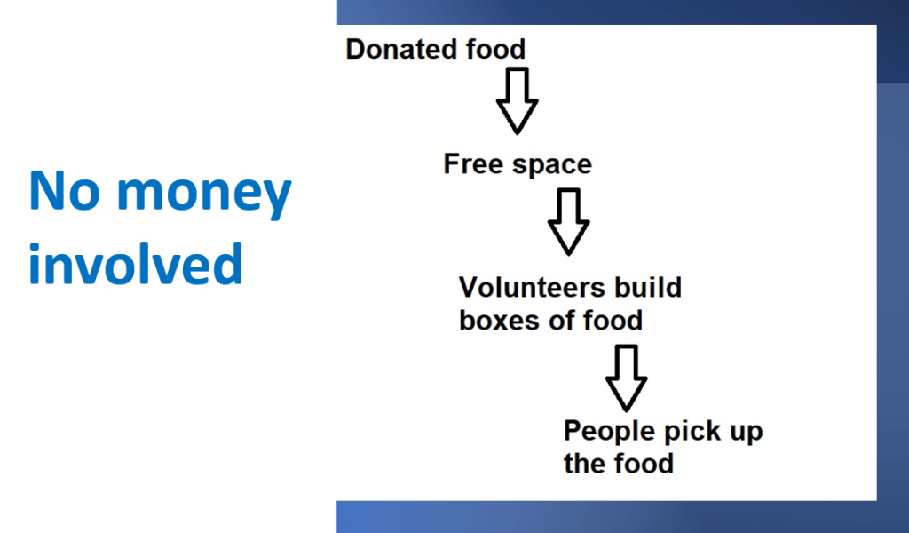 One of the basic principles of Mutual Aid is to replace the capitalist economic system. The following shows no money is involved in our food distribution project. Of course, someone pays to make the food that is donated. But this is food that would otherwise not be used. In a local community it is possible to have the food produced without money when the farmers are supported in nonmonetary ways by the community.