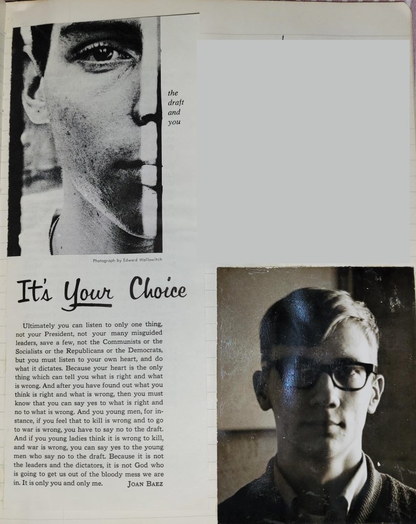 I sometimes included printed material in my journal. The following, It’s Your Choice, was written by Joan Baez, a folk singer and peace advocate. Which includes a photo of half of a young man’s face. I put a photo of myself at the time on the right-hand page of the journal entry for November 6, 1969. (Photography as part of my foundational story). Getting close to my eighteenth birthday, Nov. 21, 1969, when I would have to decide whether to register for the draft.