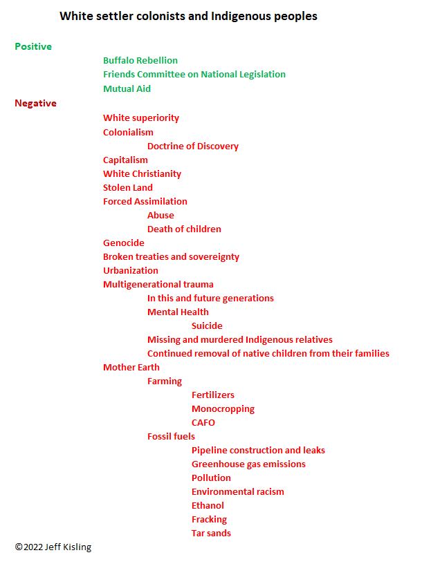 Following is another way of looking at the relationships between White settler colonists and Indigenous peoples. White Quakers need to acknowledge that when our ancestors came to these Indigenous lands, they were settler colonists. And since we are still occupying these lands, we are settler colonists, too. Some White Quakers were involved in the forced assimilation of Indigenous children. We are implicated in most of the “negative” things listed below.