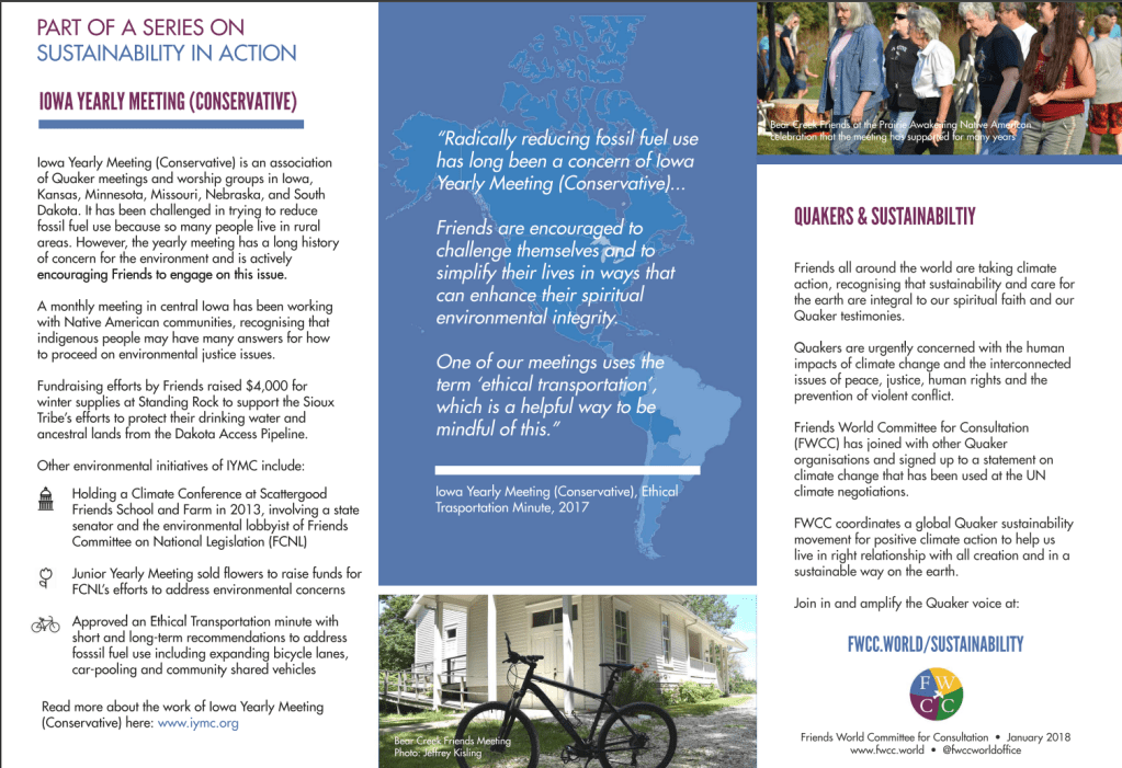 Radically reducing fossil fuel use has long been a concern of Iowa Yearly Meeting (Conservative). A previously approved Minute urged us to reduce our use of personal automobiles. We have continued to be challenged by the design of our communities that makes this difficult. This is even more challenging in rural areas. But our environmental crisis means we must find ways to address this issue quickly.