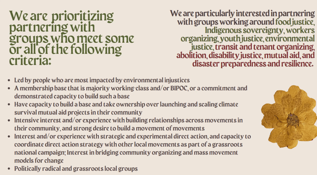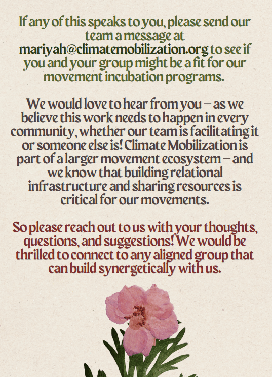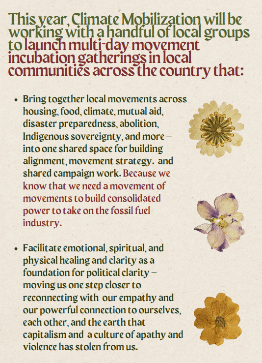 Recently I’ve been in contact with the Climate Mobilization Network, which has re-evaluated their strategies to address our climate emergency. “We are incubating local movements rooted in healing, community care, and climate survival mutual aid that asserts our needs in the face of climate disaster.”