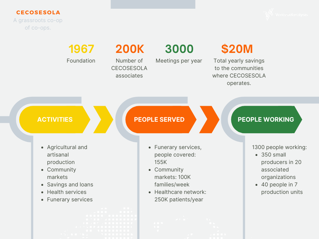 I previously began to describe the Cecosesola Co-op (See: http://bit.ly/3mrdtop). I had been doing research to find examples of large mutual aid communities when I started to see stories about Cecosesola. This InfoGraphic from Venequelanalysis shows there are one thousand three hundred people involved.