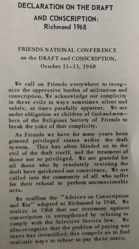 I turned eighteen years of age while a Senior at Scattergood (1969). Young men were required to register for the Selective Service System at that age. The choices were either to do so, or apply for Conscientious Objector status, or do neither and face imprisonment.