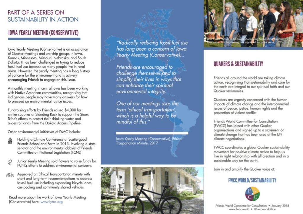 Radically reducing fossil fuel use has long been a concern of Iowa Yearly Meeting (Conservative). A previously approved Minute urged us to reduce our use of personal automobiles. We have continued to be challenged by the design of our communities that makes this difficult. This is even more challenging in rural areas. But our environmental crisis means we must find ways to address this issue quickly.