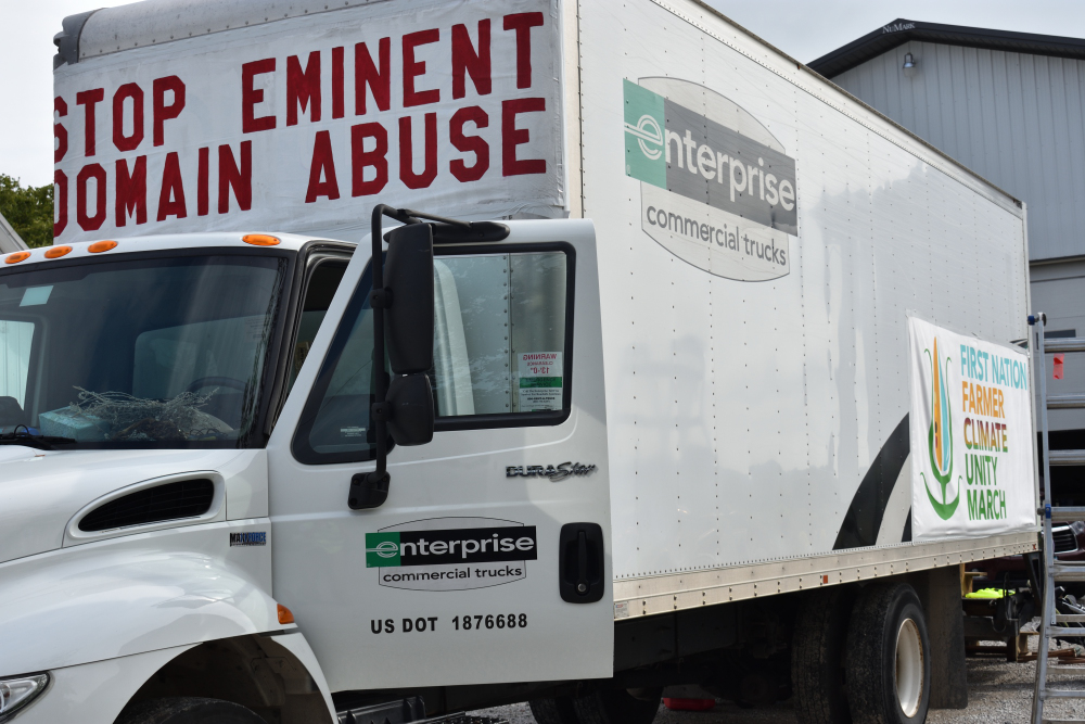 One of the main objectives of the First Nation-Farmer Climate Unity March was to call attention to this court case. We had a large banner saying Stop Eminent Domain Abuse with us on the March. A similar sign was painted on our portable rest room/shower.