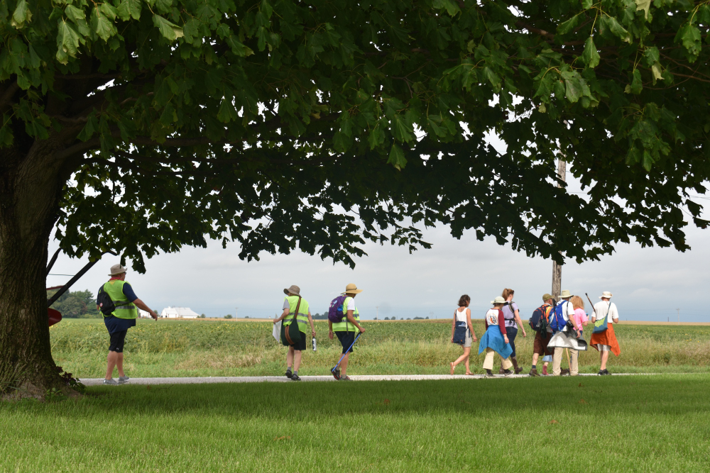 When we arrived yesterday I discovered I had worn a hole into the sole of my shoes, and developed a blister. I would have been more concerned but I had seen Miriam work on a number of other people’s blisters. She cut a piece of adhesive foam larger than the blister, then cut a hole in the middle of that the size of the blister, to help keep pressure off it. Then the ever useful duct tape was wrapped around the foot to hold things in place. And it worked pretty well. A photo of my bandaged foot was included in the article about the March in the Fort Dodge Messenger, Many Steps, One Journey.