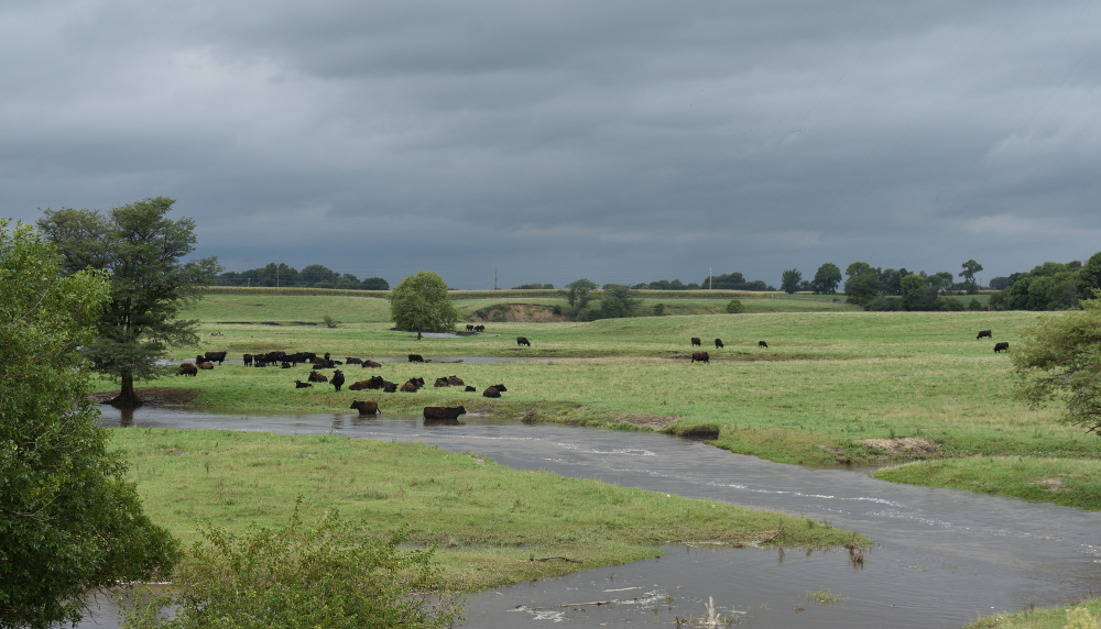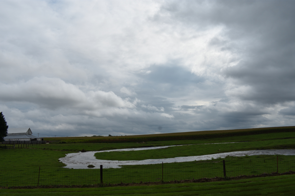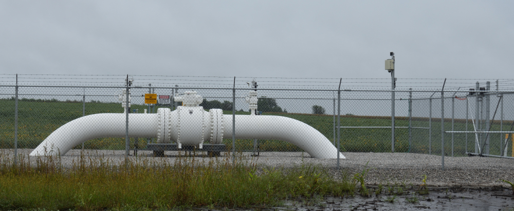 Before crossing the river just before reaching our destination of Pilot Mound, we came to another pipeline crossing. We could see the area where trees had been removed to build the pipeline on the hill on the other side of the river.