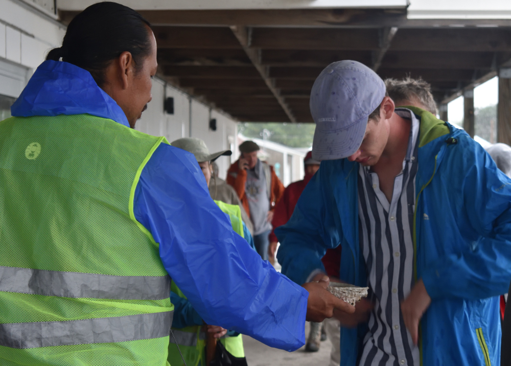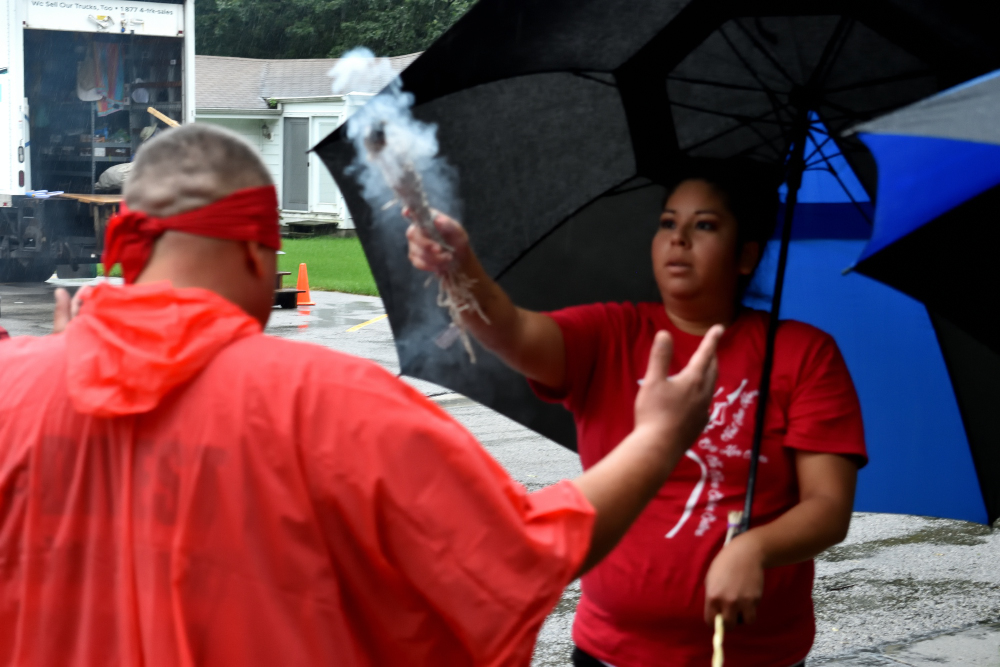 It was raining harder than ever when we started out that morning. But again, I didn’t hear any complaints. We were warned to be more aware of traffic because we started out going through town. Before we started burning sage was brought to each of us. And Alton made a raincoat for his dog Oceti.