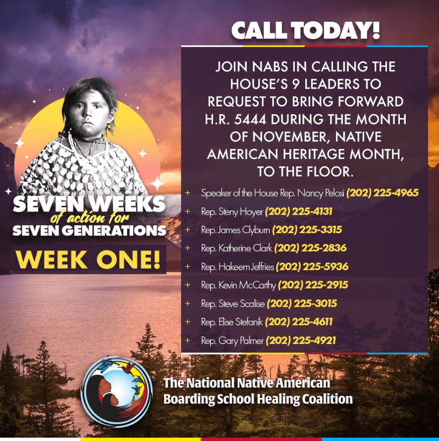Week One of Seven: Help us bring justice, accountability, awareness, and healing by telling the unvarnished truth about America’s history and genocide committed against Indigenous Peoples by way of Federal Indian boarding school policies. NABS asks that you please call the U.S. House leadership and request “they bring forward HR. 5444, the Truth and Healing Commission to the floor to vote on during November which is Native American Heritage Month.” #NABS#Time4Justice