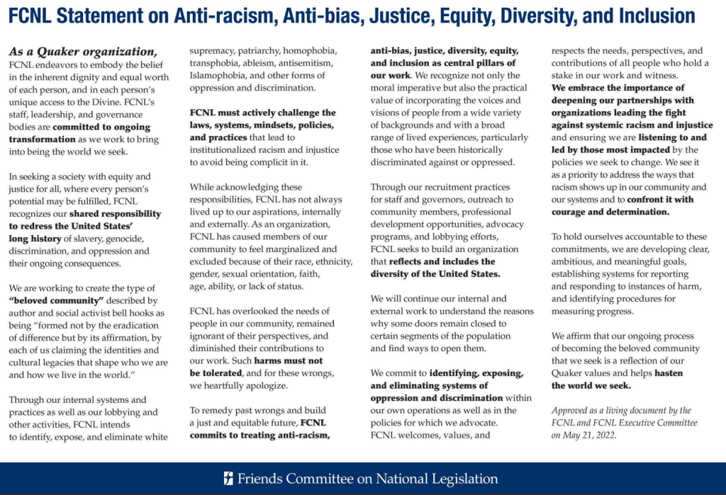 As Black History Month begins, here is an article by Lauren Brownlee. Following that is the new FCNL Statement on Anti-racism, Anti-bias, Justice, Equity, Diversity, and Inclusion that I wanted to share with you.