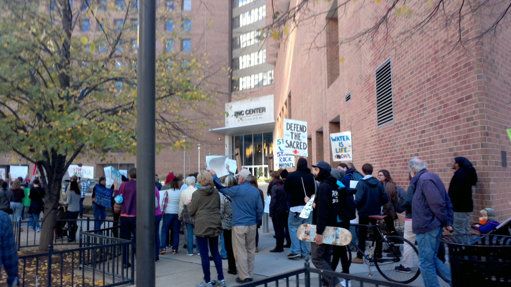 One day (2017) in Indianapolis a group of us marched from the Eiteljorg museum to two of the banks funding DAPL, Chase and PNC. We stood outside each bank in silence, with our signs, as people with accounts went into the bank to close their accounts. $110,000 was withdrawn that day.