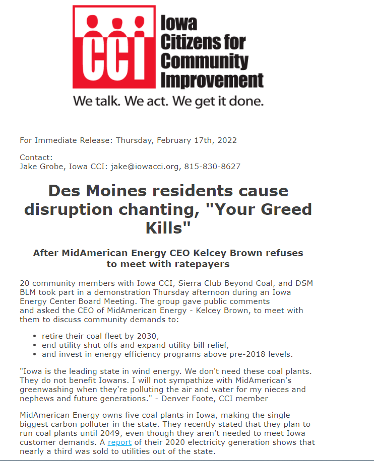 –Phase out their five remaining coal plants in Iowa by 2030 and replace them with wind and solar plus energy storage for 24/7 carbon-free electricity use –Increase funding to insulate and weatherize Iowa homes to lower energy bills and save on energy use (to make up for the bad bill MidAmerican lobbied Iowa to pass in 2018 that cut funding requirements for much-loved energy efficiency programs.) –Stop utility shutoffs and provide energy debt relief for working families (MidAmerican made a record $883 million in profits in 2021)